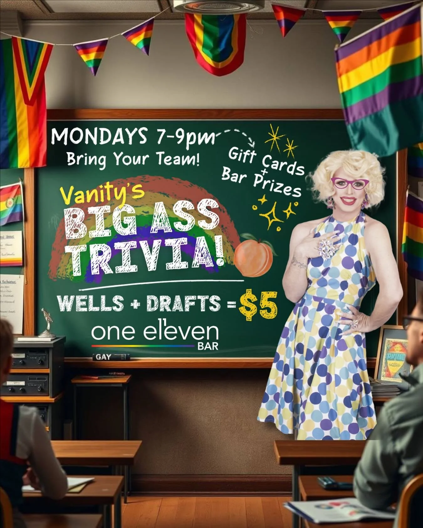 View fullsize MONDAY FUNDAY 🍻 Come for the $5 drinks, stay for some BIG 🍑 TRIVIA with Vanity at 7pm!